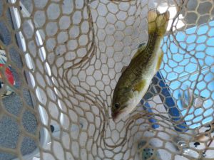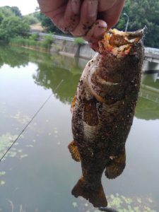 しかし釣れないので、小移動。下流に向かうとアオコが。その切れ目を狙ってみるも反応なし。また小移動。小さなドブの流れ込み。しかも上からのカレントも効いてる。一通り投げて反応がないので、HPシャッドテールのダウンショットにして、足元の流れの当たる岩の角に入れてみる。こうなったらサイズではなく何とか1本!と思っていると、ラインにちょっとした違和感が。聴くようにしてみると、生命感が伝わってきた。「ワームがちっちゃいのでギルかも、でもバスであってくれ~~」と祈りながら巻いてくると、小さいながらバス。キャッチして、ネットに入れて受付に持って行く。