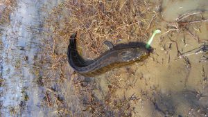自分もお付き合いするようにやってみる。するとまたコンと当たって合わせると草の上でドッカン!デカい!!強い引きが続くが途中からなんだか違う感じ。寄せてみるとライギョ。午前中の十市はこれで終了。