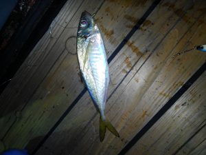 すると、1投目からコンコンコンコンとアタリ。ゆっくり巻いてきたらナイスアジ。非常に嬉しい。魚が釣れるってこんなに嬉しいんだ!と再確認。コーフンしすぎて巻きすぎたくらい。