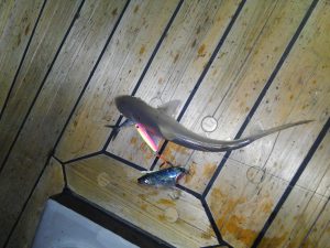 やや大きく引き込んだところで合わせると、乗った感じはあったものの引きは弱く、軽くキャッチ。人生最小のサメ。こんなにちっちゃいのによく針に掛かったなぁサイズ。