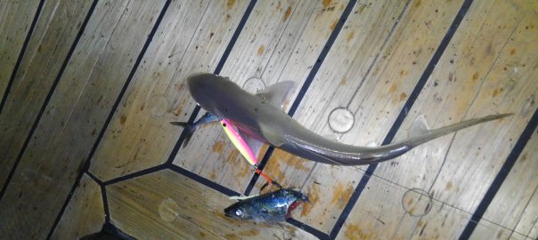 ここで、また狙いを変えて、ジグのフックに先ほど釣れたサバを付けて餌サメ狙い。
