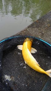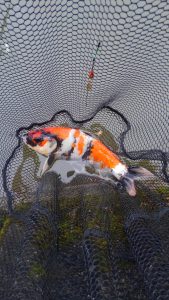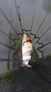 席に戻りまた同じスポットに打つとほどなくまた浮きに変化。合わせると乗って、先ほどよりは軽い引き。寄せてキャッチ。ここまで全部色鯉。黒がイイーーー‼