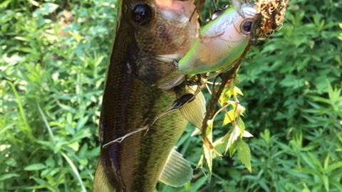 セカンド木陰、着水させると、スーーーっと近づく波、からのグン!ヒット&キャッチ。小さいけど嬉しい。久しぶりのバス。