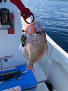何度か入りなおしていると、イイ当たりで乗ってタイっぽい引き、今日一なので慎重に上げてきたらタイ!