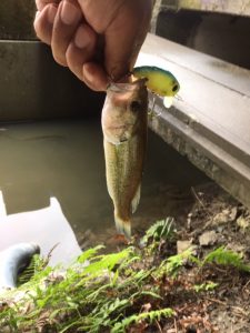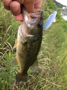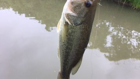 6月4日 夕練。十市。池の畔で会う人会う人そこそこ釣ってるという。西岸の橋の上から本池側をドライブシャッドで打っていく。手前の開けたエリアでのはギルっぽいアタリはあるものの、釣れず、徐々に奥に行く。かなり沖目でウイードがモワ!そこに向けて投げると、少し届かない。しかし、引き始めるとすぐにアタリが来て、引っ手繰られ、そのままフッキング。ちっちゃいけど嬉しい1匹。