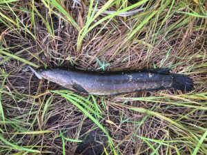 その後近くで何度か反応があったものの乗らないが続き、スロープ際まで来たところ、岸近くでコン!「ギルかな?」とそのままにしておいたら、またコン!から持っていかれ、合わせると乗って、いきなりジャンプ。ライギョだ!で、キャッチ。