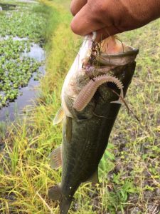 それでも藻の濃い所にいる、沖にいるのは分かった。同じようなところを打っていくと、アタリがあり、今度はかなり強めに合わせると乗って、ソコソコの感じ。しかしかなりの遠距離。強引にグリグリ巻くが、藻に絡まれそうになる。ドラグを一段強め、強引に巻く。手前で、より一層藻に突っ込まれたものの、何とかキャッチ。それほどデカくないけど、嬉しい1匹。