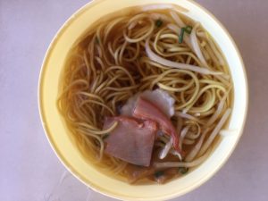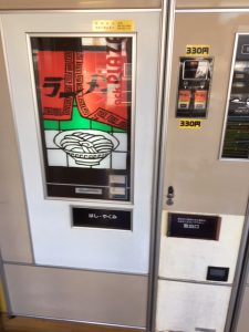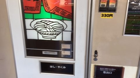 SNS情報で、レトロな自販機群があるという。で、あの、チープなうどんが無性に食べたくなって、出かけて、行ってみれば、値段が、てんぷらうどん300円、ラーメン330円。そうなると、急に気分がラーメンになったので、そちらに変更。出てきたラーメンにはチャーシュー、モヤシ、ナルト、ねぎと、一応のモノは入っている。器は薄黄色の薄いプラスティック。ぶよぶよで、頼りない。味は…うーんチープ。懐かしい!電車で釣りに行ってたあの頃を思い出す。