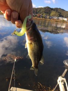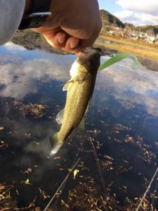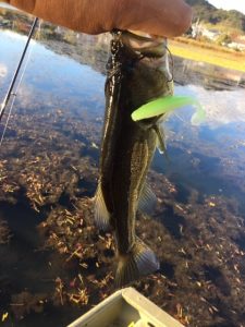 1周終わって、先ほどの西のワンドの杭をやるも反応なし。もう一度、東のブレイクをやり、何も無し。ここからシャローに入り、北のシャローのホテイの際にヒシモの根が残ってるエリアに来ると、投げるごとい水面がバシャ!浮いてるギルがルアーの影に反応して逃げてる感じ。そのうち1匹でもバス居てくれたらなぁ・・・何投目か、やぁっと反応が!来た来た。ばらさないようにゴリ巻き。ルアーはドライブシャッド。もう無茶苦茶嬉しい!!これで帰れる。