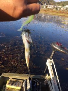 ふと見ると、先行艇はディープでちょいちょい釣ってる。サイズは小っちゃい感じ。でも、せっかく船出したのだから、1匹は釣りたいよなぁと真似してディープ攻めをしてみるも、ノー感じで、再びシャローに行く。