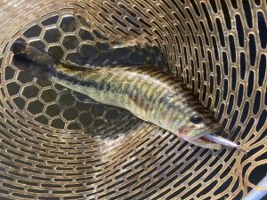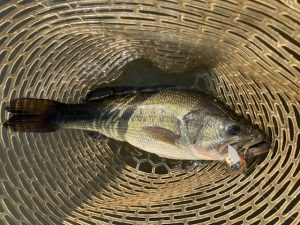 西のブレイクに入って、杭がらみで何やら違和感があり、聞いてみるとグンと来てさっきより良いサイズ。キャッチしてみると頭から丸呑み、さっきの違和感は吸い込んだ瞬間だったんだ。