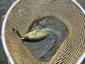 でも、反応するじゃん!で続けて、スロープ前のシャローでパチュ!で合わせると飛んできて極小 でもバジンで釣ったから嬉しい