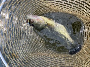 北も西も何もなく、なになに?で、南のドシャローでハクにライズする魚を発見!とりあえず行ってみる。も際で盛んにライズが起こっているので、そこを目掛け、サーディンを投げ、水面に波紋を残しながら引いてくると、コン!