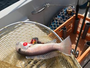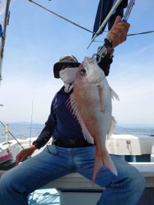 着底、10巻き、着底から1~2巻きでグッと押さえられ、いきなり走る。ドラグはユルユルにしてあるので大丈夫。走りたいだけ走らせて巻き、走ったら無理しないでゆっくり上げてくる。「ここはシロアマが出るからシロアマか?」と船長が言うが、引きの感じがどうも違う。ロッドを鋭くたたく感じから真鯛かもと思いだす。なかなか姿が見えない。リーダーが入り浮いてきた魚はマダイ!!やったやった!!無事ネットイン。