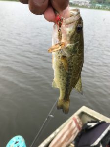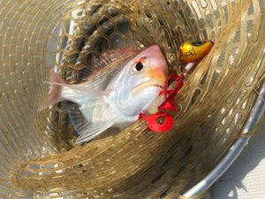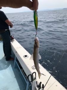 水深が40mに来たところで、タイニークランキーにして何度かスローにしゃくっていると、軽くコン!あげてきたら極小エソ。