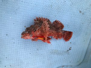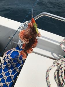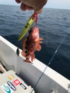ヘッドを80ℊにすると、いいアタリが来たものの、途中でバレ。回収すると、スカートとフックがかみ切られている。今思えばこの時のスカートは黒。たぶんフグかエソ。100ℊジグのタイベイトにしたりするものの、イマイチぴんと来ない。船は全然流れない。これならと、この水深でも大丈夫のはずと、昨日購入したタイニーレクターの60ℊにする。レクターなら自信をもってしゃくれる。何度か上げ下げしていたらグッと重くなったものの全く引かない。石かもとか言いながら上げてきたらオニオコゼ。小っちゃいけど嬉しい。