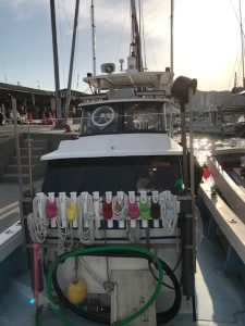 今まで水深は65~70m、船長は無線でやり取りをして80mラインに移動。移動中別の占いで見るとラッキーカラーは黒とのこと。ヘッドは100ℊ赤黒、スカートは黒のストレート、トレーラーにドライブクロー2in黒にして落とす。