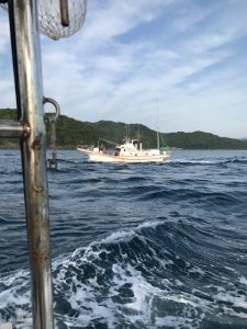 しばらく待つと、開会式。終了後、徒歩で漁協まで移動し、乗船、出港。06:30ごろ。