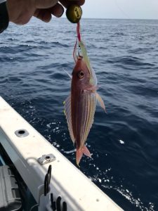 沖に出ると、結構うねりが高い。船も全速では走れない。ハーフスピードで30分ほど航行し、第1スポット到着。水深は62mほど。とりあえず100ℊタイラバで始める。第1沈、落として、巻いて落として巻いて落として巻いて…反応なし。オモテではエソ。銀のジグ。