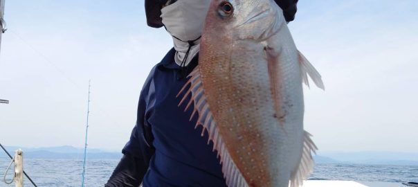 着底、10巻き、着底から1~2巻きでグッと押さえられ、いきなり走る。ドラグはユルユルにしてあるので大丈夫。走りたいだけ走らせて巻き、走ったら無理しないでゆっくり上げてくる。「ここはシロアマが出るからシロアマか?」と船長が言うが、引きの感じがどうも違う。ロッドを鋭くたたく感じから真鯛かもと思いだす。なかなか姿が見えない。リーダーが入り浮いてきた魚はマダイ!!やったやった!!無事ネットイン。