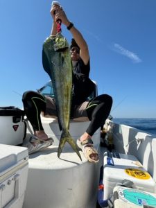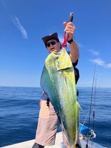 リールを巻くけどいつまでたってもラインが張らず、船の横でシイラがジャンプ!で、自分のジグを咥えてる、からの強烈な引きでしばらくファイトする