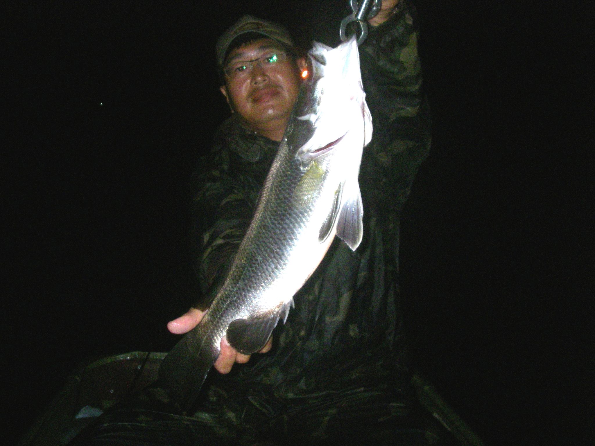 船出し場より少し上流、アマギを釣ったところまで昇ると、人が釣りをしているように見えた。ライトを当てるのも失礼と思い、少し遠巻きに流し始めた。その人っぽいものは全然動かなかった。もしかしたらゴミかなんかかもしれない。アマギポイントは潮が下がった関係か浅く、ディープダイバーはおろか、ミノーでさえ底に当たる。「ちょっと浅すぎますね」「でもあれだけアマギが居たのだからもしかしてアカメも食いに来てるかも」ってことで、流されるままにいた。船は中州の方に流れていった。今回はエレキは積んできていない。魚探もない。船外機だけだ。中州にきた。まだ露出していないが、ライトを当てると底が見え、あと数十センチだ。パチャ!と音がした。小さな魚のと思い、ココでチヌロッドにマイティーペッパーの5cmを付け投げる。カラーは目立つように黄色クラウンにした。1投目、底に当たるのとは違うアタリがあったが乗らなかった。「今アタリましたよ!チヌかも・・・」で、2投目ガツっとヒットした。引きは小さめのチヌの感じ。寄せてみると25cmくらいのキビレだった。「それ頂いてイイですか?」とOさん。「イイけどどうするんです?」「いや、餌に・・・」「って、デカ過ぎじゃないですか?」