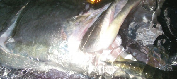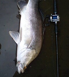 船に戻ると02:00だった。潮は完全に引き上げ潮にかかっていた。船がだいぶオカに上がった感じだ。船を出し、上げ潮ということで、岩盤の下流の流れ込みまで走らせた。ここから流されながら上流に行く。エンジンを止め、流されにかかるが、思ったように流れない。上げ潮流だし、まだそれほど効いていないようだ。風は雨の時以外ほとんど吹かず影響はない。それでも少しずつ上流に向け流れ出した。前半よりはゆっくり探っている感じ。大岩の張り出しの下流の垂直岩盤を少しずつ流し、そろそろ張り出しの手前だなってところでグッとルアーを止められた。それまでの底に当たる感じとは全く違う感覚だった。ラインがナイロンなのでカツッやカンというアタリでもなかった。「来た!」と告げると同時にズッとドラグが出た。「デカイ!!」またドラグを出された。ラインは30ポンドで船からなら大丈夫なはず。引きの感じからイイサイズだとはわかるが、アカメとも確信が持てない。第一、初めて四万十川に船を出して、何もわからないままアカメが釣れてしまうなんて絶対ないとその時点でも半分は思っていた。「でかいけどアカメかわからない。アカメにしては飛ばないし・・・」とOさんに言ったとたん、船縁でドバババと飛んだ。「アカメだ!!」2人同時に叫んだ。とたんに緊張してきた。それまでは「もしかしたらコイかも」「・・・」のあとにはそう言おうと思っていた。