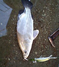 次の日からココ通いが始まった。数日後、同じようにBLITZ MAX DRを引いてきたら途中でテトラにあたった感じがした。「あそこにもテトラが沈んでるんだ」と思いながらもう2巻きほどしたときに「コン!」とアカメっぽい当たりと共に、強烈な引きが来た。アカメ、しかもかなりデカ目と確信した。何度かドラグを出され、浮いてきて飛んだ。アカメだった。前日のスズキと長さは同じくらいだけど引きが相当強い。何度も走られ、飛ばれながらやっと足元まで寄せてきた。それでも手前は牡蠣のはえたテトラで、あれにPEが擦れたら一発だ。久々のデカアカメだし、OSPだし、出勤前だし、コ レばらしたらどうなることかと半分怖くなる。何とか取り込めそうなスペースを見つけ、そこに誘導し、手を出したらまた走られた。何とかラインが擦れるのを食い止めもう一度手前に寄せ、やや強引にランディングした。テトラを渡り、足場までくると、上から「デカイねぇ!それは何?」と聞かれ仰ぎ見るとおじさんがランニングの途中みたいな感じで見ていた。声を掛けられるまで全く気づかなかった。「アカメです」と答えると「ちょっと見に行ってもいい?」と言われ、階段を下りてきた。「デカイねぇ!写真撮ってもいい?」と言うので、「どおぞ」と言った。悪い気はしない。ついでに「すみません、私の携帯でも撮ってもらえます?」と聞くと「イイですよ」と言ってくれたので久しぶりのブツ持ち写真を撮ってもらった。