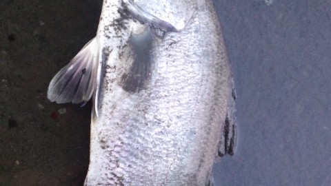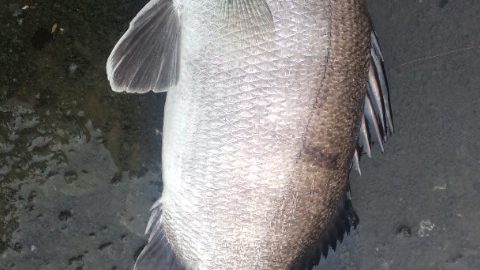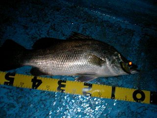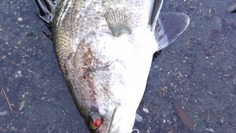 再度下流に戻り流し始めた。垂直岩盤で軽いアタリ。あげるとソゲ。20cmもない。でもこれで1晩にブリッツだけで3目達成。マイティーペッパーと合わせて今晩5本目。ココでついにOさんもブリッツに変更。岩の張り出し辺り、60弱の釣れた辺りまで流していくが、何もなく、そろそろ空も白みはじめた。明るくなると水が綺麗なだけに釣れそうという感じがだんだんしなくなってきた。でもまだ水面にはもやが出ており、完全に明るくなるまでは粘ってみた。06:00「もう1流ししますか?」と聞くと「いや、もういいです。集中力も切れてきたし」ってことで、あがることに。船出し場に行く途中また雨が降ってきた。それほど強くなく距離も近いのでカッパを着ずにそのまま行った。船をズリ上げたところで雨が強くなってきて、車に避難。しばらくしたら止むだろうと思っていたら勢いを増し、ゾーゾー降り出した。そのまま1時間近く降り続き、その間に一睡もしていない2人は落ちた。1時間半ほど眠っていたら雨は小やみになった。船を見るとあふれ出しそうなくらい水がたまっていた。込み潮なので少し浮いた状態になっていた。スロープにズリ上げようとしたが重くてあがらず、手を突っ込んで水栓を抜いた。船に残した荷物は水没していた。水が大方抜けた。アカメとチヌは元気にいた。ココまで連れ回しておいてなんだが、早く返してあげたい。まずはアカメ。スケールを当てると83cm自己記録には届かないが、2番目。続いてチヌ。今日のは本チヌ、つまり黒鯛。ルアーで初めて釣った。ダービー用なので慎重に計る。残念ながら50に0.5足らない。ダービーなのできちんと計った。普段なら50にしておくサイズ。49.8くらいだったけどま、大会だから辛めにと思って49.5cm。