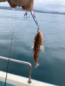 とりあえずタイラバを落としてみるも反応はなく、40gほどのメタルジグに代えるとコツっと小さなアタリ、やったやったとゴリ巻くと上がってきたのは小さなエソ