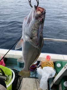 水深40mほどのフィッシュマークに行くと魚は移りものの釣れず、プロッターを見ると近くで等深線がくねっと曲がっている所を発見!そこに行ってみると、いい感じの反応があり、タイラバでは釣れず、TGベイトの45gにしてしゃくっていると、軽くゴンときて乗らず、いったん落としてまたしゃくってきたらゴン!からの強い引き、ちょっと重くて鋭さはない、ハタ系の引き