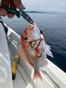 前回と同じ45gのTGベイトでやっていると、コンときてタイっぽい引き、WinWin初タイかもと慎重に上げてきたらやっぱりタイ!やった!と思ったものの、横から青長い魚がス~~~っと寄ってきて、タイに近づいたかと思うと何の抵抗感もなくリーダー切れ!サメにタイを一飲みにされた!!!