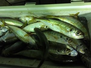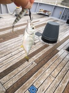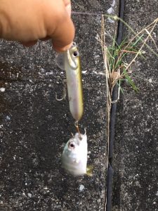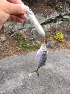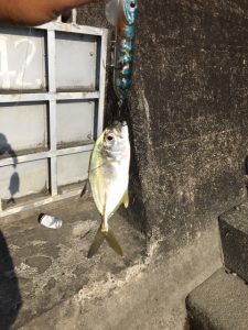 まずは、魚が欲しいので、サビキでやる。すると第1フォール中にアタリ。で、ナイスアジ。