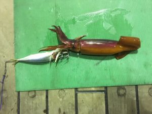 いい加減釣ったので、アジを餌にサメ狙い。しかしどのアジもナイスサイズで餌にするのがもったいない。仕方がないので、半分に切りジグに付けて入れる。30分ほどなにも無く、やや暇してたら、ティップがガクガク。ロッドを手に取って、送り込む。待って、待って、送って、送ってグ~~~~ッと合わせると、乗らない。もう一度フォールさせるとまたアタリ。また送って、送って、グ~~~~ッと持って行ったところでガツッと合わせると、今度は乗って、やや軽めの引き。ゴリ巻きして浮かせたら、小さめのサメ。ままま、狙い物が来てよし。