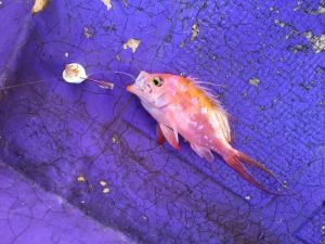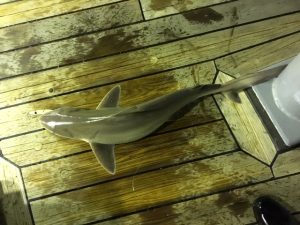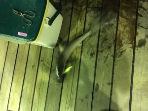 餌を付け替えて、投げ入れ、また待つ。しばらくなにも無く、止めようかと諦めかけたところで、ガツガツガツ!ロッドを手に取り、また送り込み、ガツガツガツグ~~~~っと持ち込んだところで、合わせを入れると乗って、さっきより強い引き。浮かせて来ると、(この場所では)デカ目のサメ。ネットで掬ってもらってランディングしてみると、腹がデカい。
