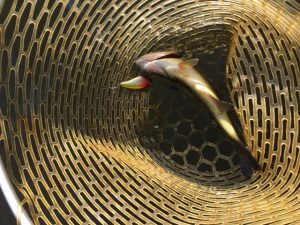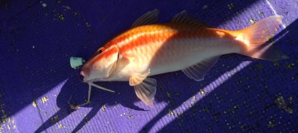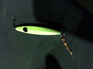 また、エサを付けて投入し、しばらく待つとガツガツガツ。合わせると乗って、水面まではス~~~ッと上がってきて、水面でロールロールロール。するとバレちゃって、でも魚はまだ水面付近におり、エサも残っているので、魚の近くに落とすと、また食って、合わせると乗って、いきなりロールロールロール。するとまたバレて、回収すると、アシストフックが2本とも切られいる。ってことは、1回目で1本切られ、2回目でもう1本切られたのかな?