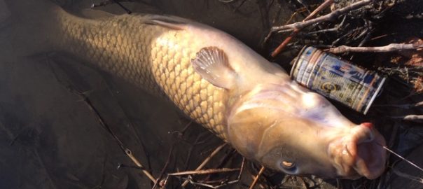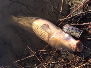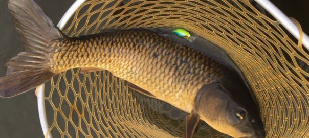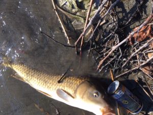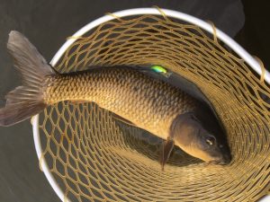 北の谷ではまた、グッと止められてからいきなり強い引きが!マヂ強い。ボートの下に潜り、ドラグを緩めて走らせる。ラインは25ポンドなので大丈夫。ゆっくり弱らせようとするが、なかなか弱らず、浮いてこない。バスではなさそうだが、姿だけでも見たい。近くには先行艇が居て、見られてる。「デカいけど多分バスじゃない」と話をする。しばらくやり取りをすると、ついに浮いてきた。デカ鯉、しかも背中にスレ。強いわけだ。こうなったら取りたい。寄せては走られを何度か繰り返し、ネットに入れようとするが入りきらない。なんとか収めて写真撮ってリリース。